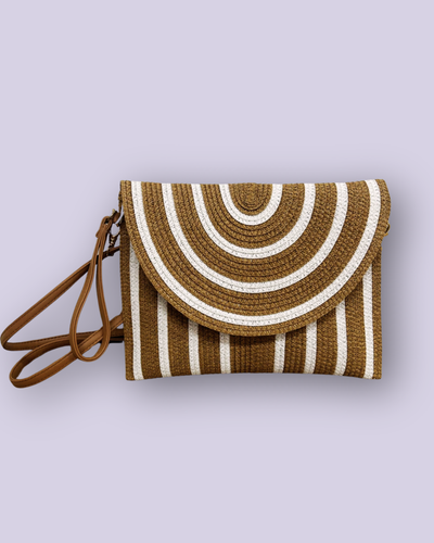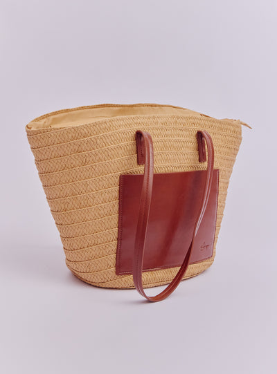 STRAW TOTE WODDEN HANDLE BAG - CAMEL