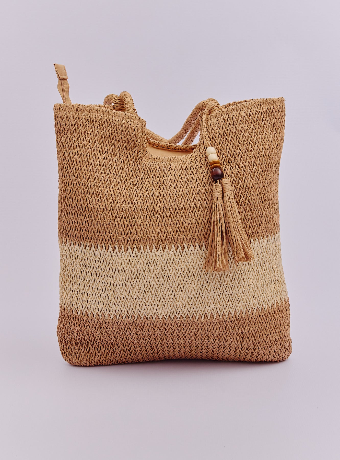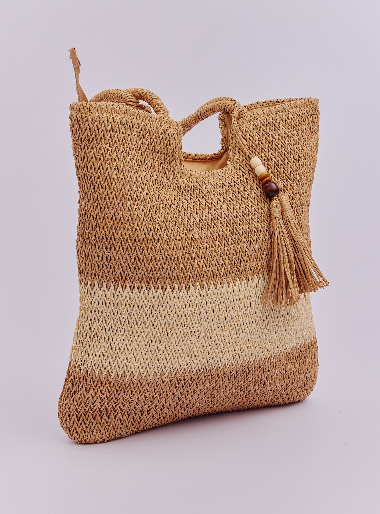 2 TONE TOTE BEADED TASSEL BAG - TAN
