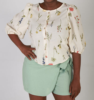 BUTTON THROUGH LINEN BLOUSE - CREAM PRINT