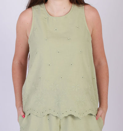 SLEEVE LESS ANGLAISE TOP - SAGE