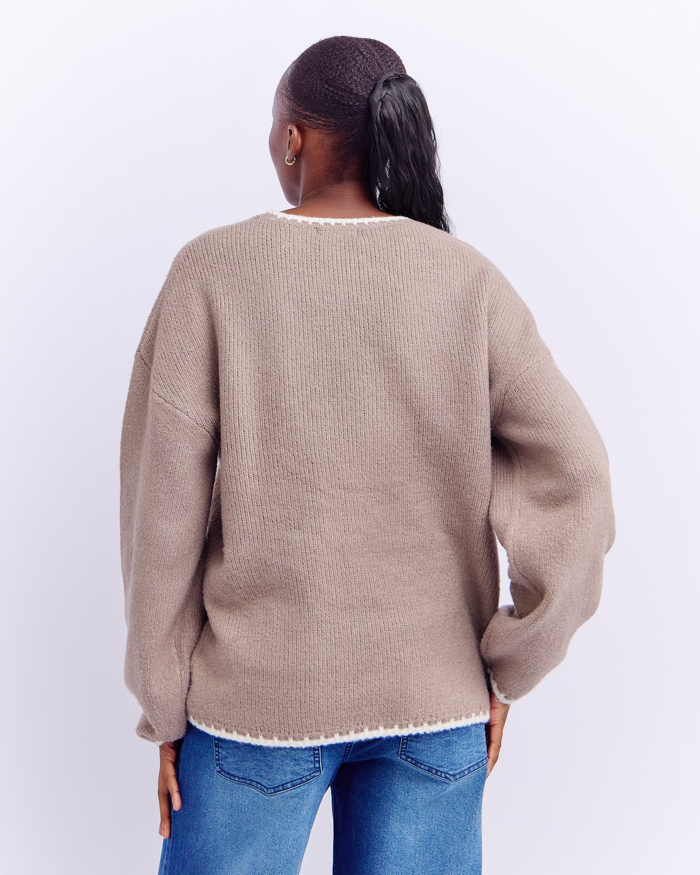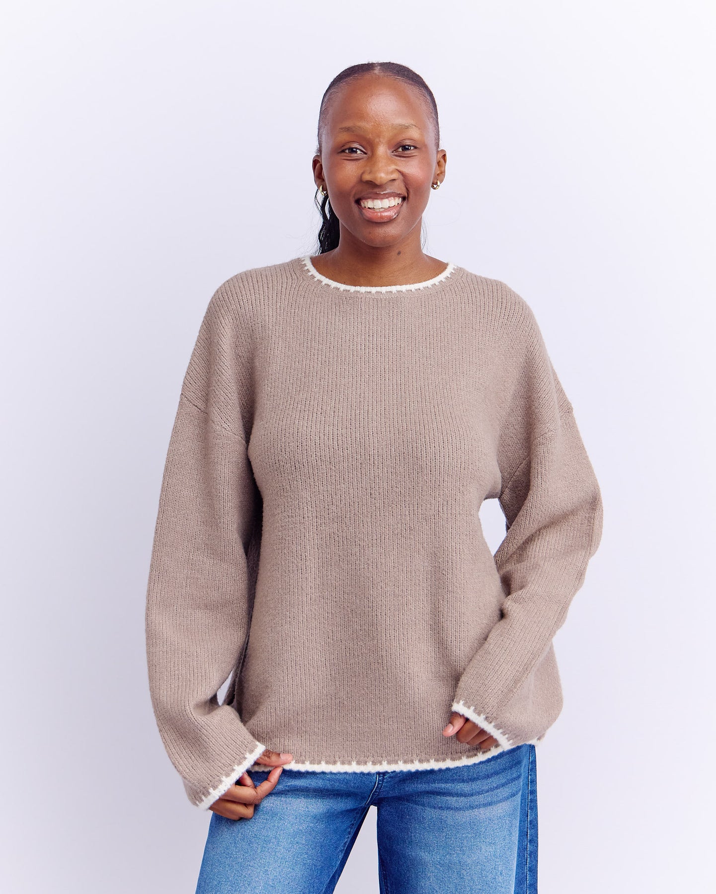 CONTRAST TIP CREW JERSEY - TAUPE/NATURAL