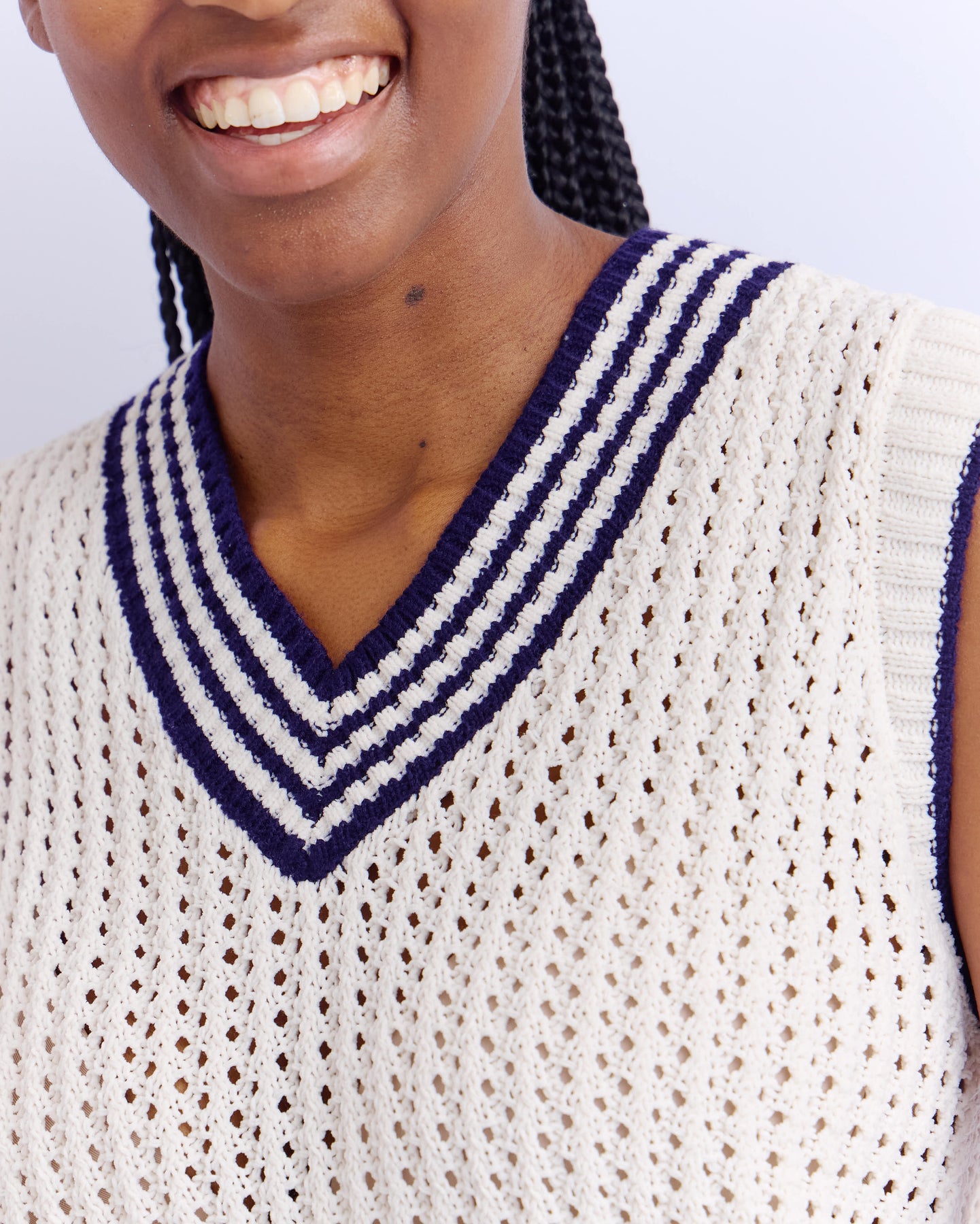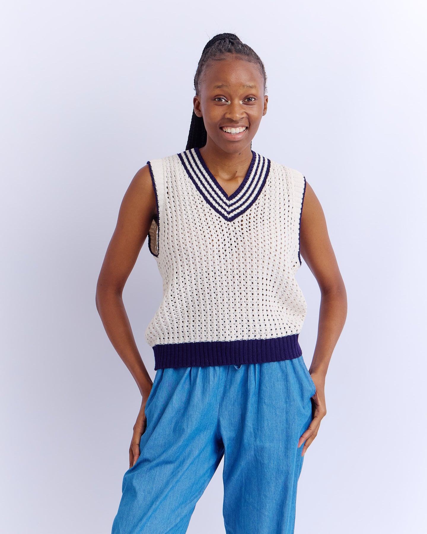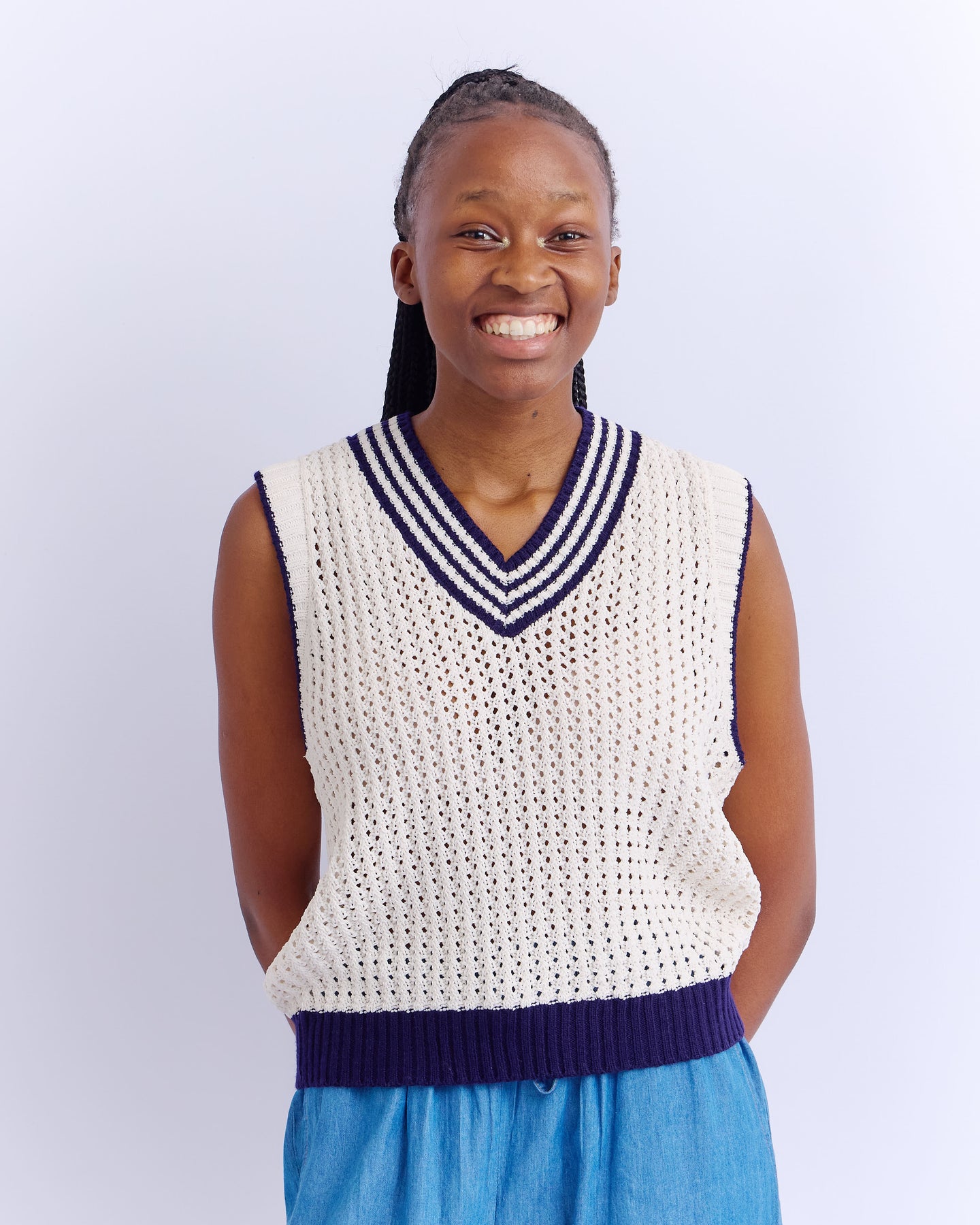 V-NECK CROCHET GILET - NATURAL/BLUE