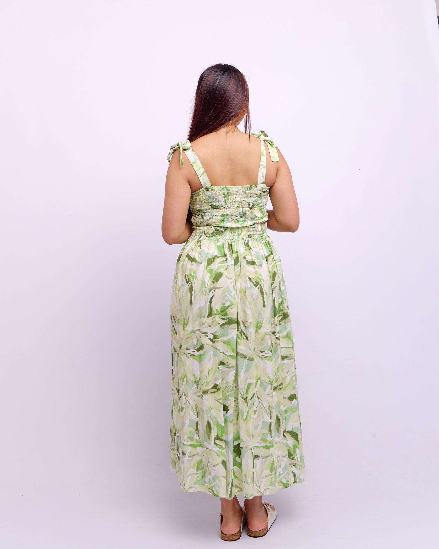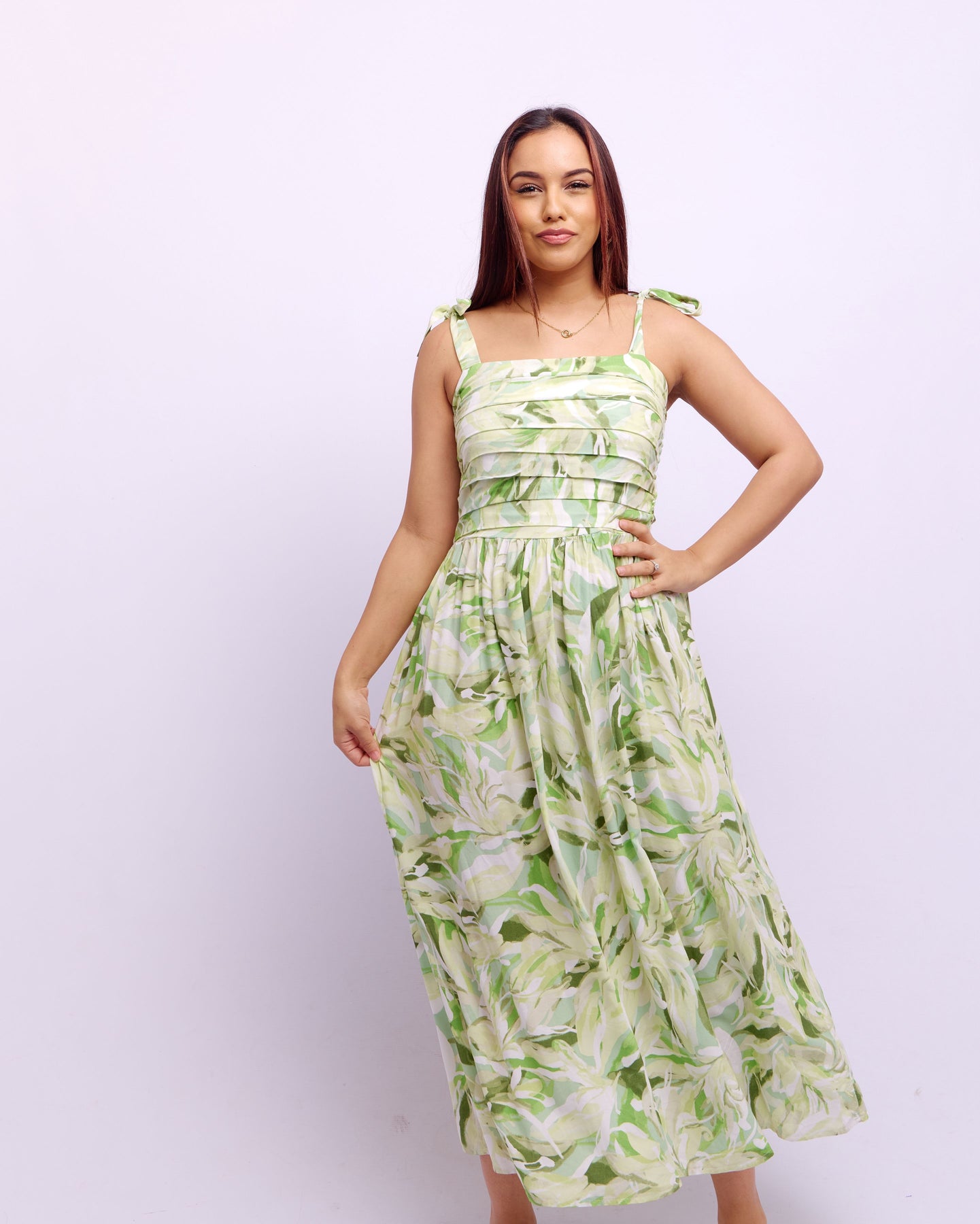 PLEATED TOP MAXI DRESS - GREEN FLORAL